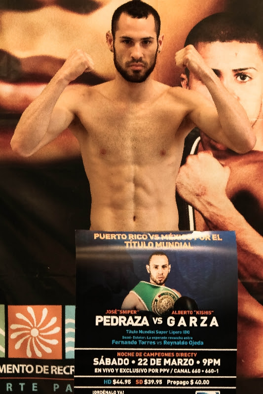 Hato Rey, PR– A 7 dias del compromiso titular del sábado, 22 de marzo en Ponce, se presento en las facilidades de la comisión de boxeo el pre-pesaje en el cual los peleadores no pueden exeder el 5% del peso pactado, el cidreño José “Sniper” Pedraza, expondrá su invicto ante su gente y buscará el título mundial de la Organización Internacional de Boxeo (IBO) de las 130 libras ademas Rey Ojeda vs Fernando Torres quienes se enfrentan en una revancha por el titulo internacional IBO. como parte de la Noche de Campeones de DIRECTV desde las 6:00 PM en el Auditorio Juan Pachín Vicéns de Ponce, en una producción de Universal Promotions y su presidente, Javier Bustillo.