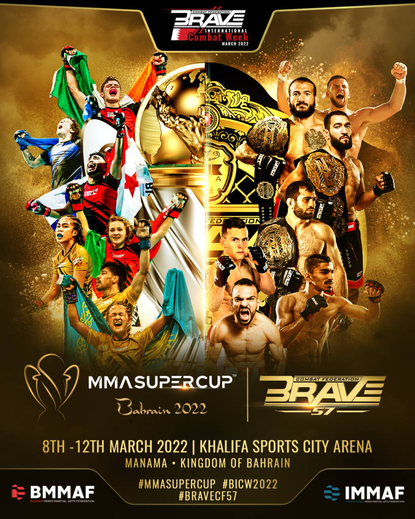 La Supercopa de MMA es un nuevo torneo promovido en asociación con KHK Sports, BRAVE CF, la Federación Internacional de Artes Marciales Mixtas (IMMAF) y la Federación de Artes Marciales Mixtas de Bahrein (BMMAF), con ocho equipos compitiendo por el título de mejor nación en el mundo y el premio en metálico más grande jamás pagado por un torneo amateur de MMA.