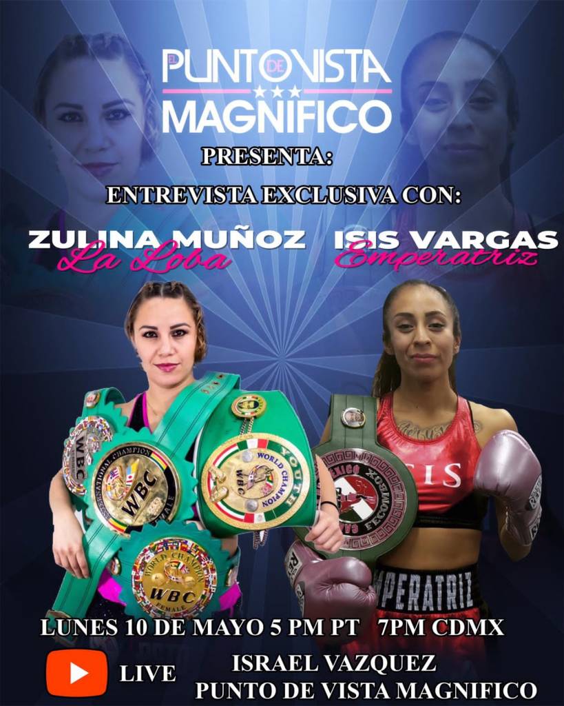 Israel Vázquez tuvo el privilegio de entrevistar a las protagonistas de la velada boxística (de transmision de paga) titulada “Belleza y Poder” que se llevará a cabo el próximo sábado 15 de mayo en la Arena San Juan Pantitlan en el Estado de México, donde Zulina “La Loba” Muñoz (se enfrentará a 8 asaltos de 2 minutos por uno de descanso) ante Isis “Emperatriz” Vargas en categoría supergallo), “La Loba” dio la información de la cartelera completa de 10 peleas profesionales, aparte de celebrarse 5 combates amateur, incluyendo la participación de su hijo que anda haciendo sus pininos en lo aficionado, y ella como cualquier madre está más nerviosa por su retoño que por su propia participación. Explicó que el protocolo de salud por motivo de la pandemia del Covid-19 está permitido al 50 % por ciento de capacidad, pero que siendo un lugar que puede albergar hasta 3000 personas se decidió que sólo se venderán 1000 boletos, o sea el 30 por ciento de entradas, y claro, habrá todas las precauciones debidas en tiempo que la poblacion transita en semáforo amarrillo, y exhorta a todos al apoyo de comprar la pelea de modo virtual que es promovida por sus entrenadores, los hermanos Ayala de la empresa Boxeo LAS. “El Magnifico” en palabras elocuentes remarcó que el récord de Zulina sin duda la ponía en el plano de favorita, porque “La Emperatriz” de una década más joven que Zulima no tiene tanta lona recorrida, pero si la reputación de sorprender a propios y extraños por su valentia y sacarse el comodín en veredictos pararelos en las tarjetas de los jueces. “La Loba” con 62-3, 2 empates y 40 cloroformos sabe de su ventaja en experiencia, pero no subestima a su oponente, puesto que Isis de 23 años solo cuenta con 8 victorias y dos derrotas, pero alega que el hambre de seguir escalando hacia la cima es su mejor motivación, ambas se declaran listas para marcar la tolerancia de la báscula establecida de 55 ½ kilogramos. Zulima confesó que siempre se prepara al máximo para dar lo mejor de sí misma y que para ella no hay contrincante fácil, que al subir al ring todo puede pasar y para evitar sorpresas desagradables entrenó como si fuera por la corona mundial. Isis al igual se preparó a conciencia, porque sabe que Zulina se llevará la mayoría de las porras por su gran trayectoria y su fama de monarca a prueba de fuego, pero “La Emperatriz” esta acostumbrada al pepel de intrusa pero quedar como heroína de la audiencia al final, porque sabe a ciencia cierta que para hacer historia en el boxeo femenil se tiene que enfrentar a las mejores en su división y subir de nivel, entrándole al toro por los cuernos. Muñoz tampoco oculta su estrategia de subir al ring a tirar golpes de ton a son, y si se le da la oportunidad de la anestesia, con gusto la aprovechara, y claro, no está enfocada en la siguiente en la mira, pero si aspira a enfrentar a Yamileth Mercado, actual monarca supergallo del CMB, y agrega que por el estilo aguerrido de ambas van a saltar chispas por doquier. Isis también pone su granito de arena asegurando que ambas van a tirarse guantadas sin tregua para el beneplácito del público en vivo, y para los que compren el metodo de paga, ya que aseguran que las riñas de mujeres bravas, muchas veces son las de mas agrado que la de los caballeros, y como punto final, Isis le da las gracias a Zulina por la gran oportunidad de enfrentarla.