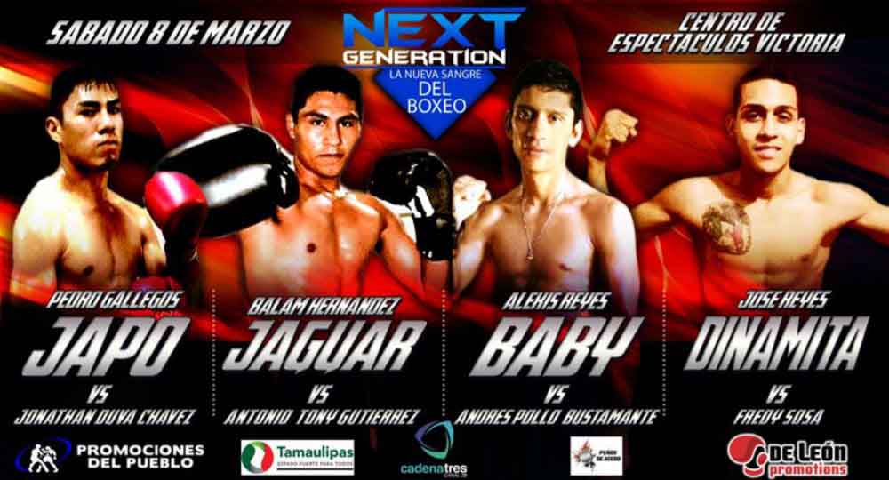La sede es El Centro de Espectáculos Victoria, donde el regiomontano Pedro “Japo” Gallegos, y el local Balam “Jaguar” Hernández encabezan la velada denominada “Next Generation” ante sendos rivales que los pondrán a prueba en la búsqueda de la consolidación en el difícil mundo del boxeo.