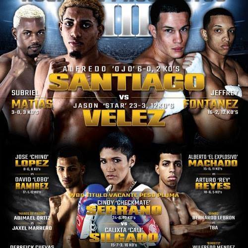Estos son: José ‘Chino’ López ( 8-0, 6 KO ) de Humacao y los fajardeños, Alfredo ‘Ojo’ Santiago ( 6-0, 2 KO ) y Subriel Matthew ( 3-0, 3 KO ). López, defenderá su invicto ante David Lobo ( 17-1, 12 KO ) de Costa Rica en combate pautado a 8 asaltos en las 140 libras. Santiago, medirá fuerzas contra el ex contendor mundial Jayson Vélez ( 23-3-1, 16 KO ) de Juncos en combate pautado a 10 asaltos en las 130 libras y Matthew, se enfrentará al pegador cagueño, Jeffrey Fontanez ( 16-2, 12 KO ) a seis asaltos en las 140 libras.