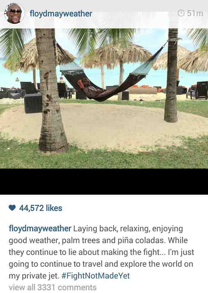“Acostado, relajado, disfrutando de un buen clima, palmeras, árboles y piña colada. Mientras siguen mintiendo acerca de hacer la pelea. Yo sólo voy a continuar viajando y explorarando el mundo en mi jet privado”