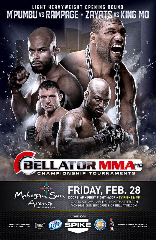 Emanating from Connecticut’s Mohegan Sun, the night features Rampage in a Light Heavyweight opening round battle with former Champion Christian M’Pumbu, while King Mo Lawal returns to face Russian submission ace Mikhail Zayats. The night will also feature the start of the Season 10 Featherweight Tournament. The official sponsors of Spike TV’s Bellator MMA Season 10 are Miller Lite and Dave & Buster’s.