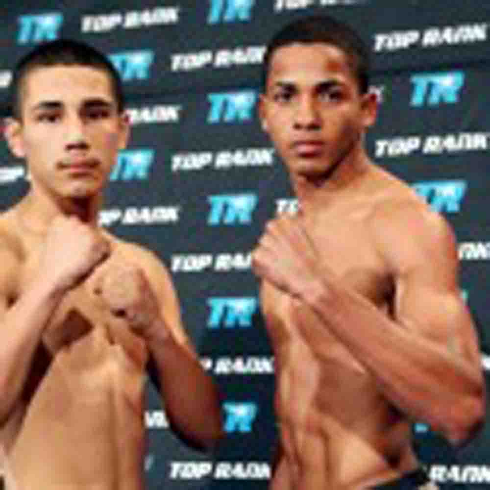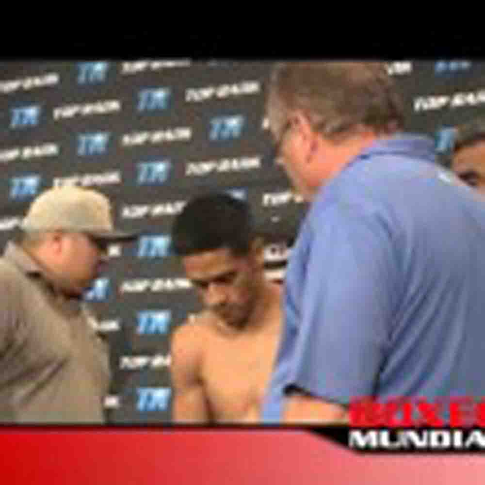 Jessie Magdaleno(pictured) weighs in (both fighters weighed 122 lbs) for his upcoming Top Rank feature fight against Jonathan Arrellano , Thursday, Dec. 6 at the Mirage Hotel & Casino on ESPN in Las Vegas