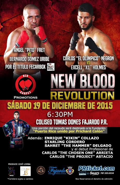 San Juan, PUERTO RICO – Listos para escribir otro capítulo en la histórica rivalidad boxística entre Puerto Rico y México, ‘Red Carpet Promotions’ decidió unir fuerzas junto al Consejo Mundial de Boxeo (C.M.B.) para añadir más emoción a la cartelera boxística ‘New Blood Revolution’, la cual se celebrará el sábado, 19 de diciembre desde las 6:30 de la noche en el Coliseo ‘Tomás Dones’ de Fajardo.