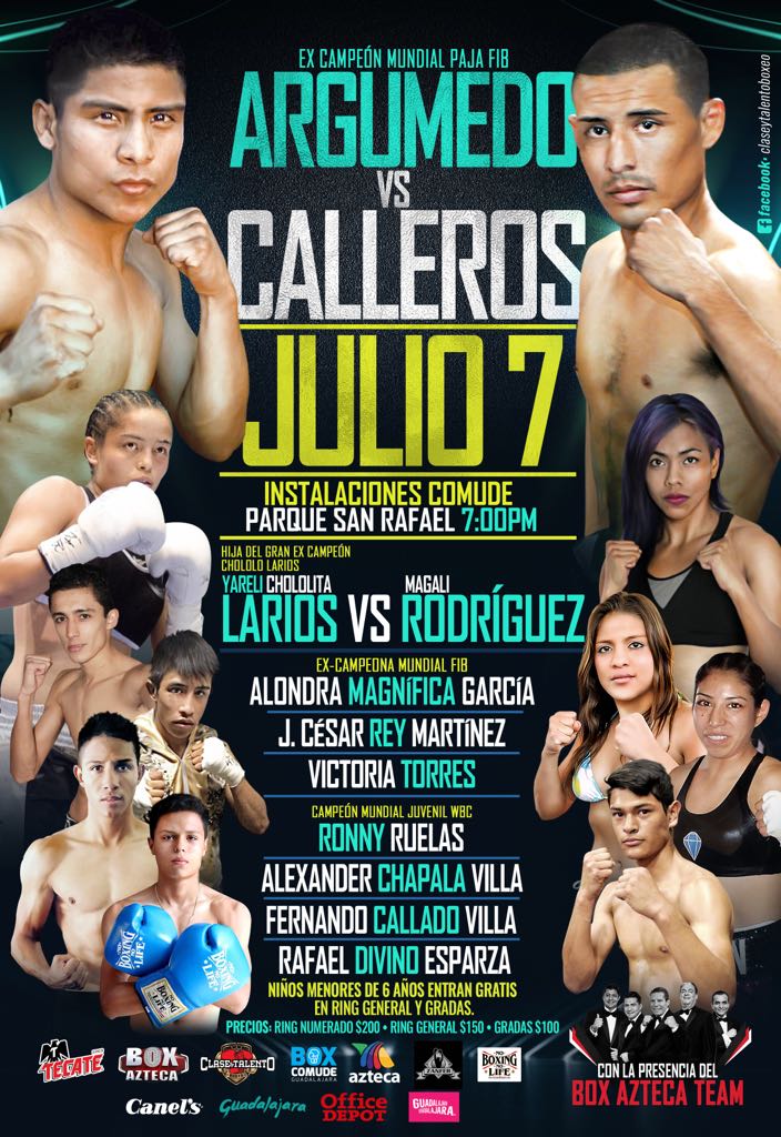 Con mucho en juego, el “Tecuala” Argumedo (21-4-1, 13 ko’s) y el “Taz” Calleros (28-8-1, 16 ko’s) se medirán a 10 rounds en peso Minimosca, encabezando una atractiva función de Clase y Talento, Comude de Guadalajara en asociación de Promociones Zanfer a realizarse en el Parque San Rafael, con transmisión de la Casa del Boxeo, Azteca 7, La Casa del Boxeo.