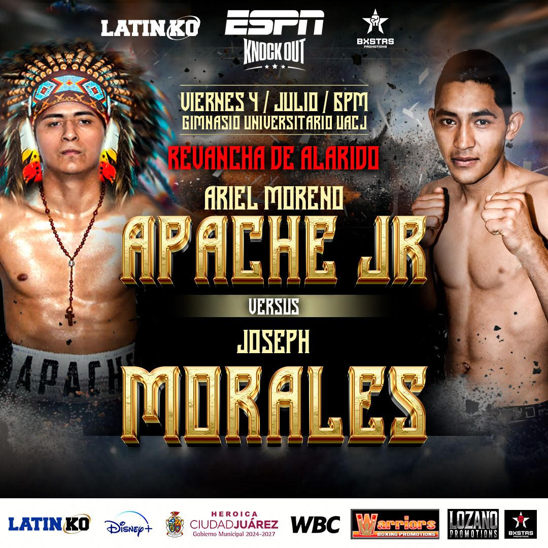 Una sorpresiva victoria, con méritos propios del capitalino Joseph Morales, le arrebató el invicto al juarense Ariel ‘Apache’ Moreno Jr. en octubre de 2023; de inmediato el hijo menor de Santos ‘Apache’ Moreno pidió la revancha, sin embargo por diversos factores no pudo efectuarse de forma inmediata y será este viernes 4 de julio, cuando se enfrenten en el respaldo de la cartelera que será transmitida a más de 20 paises por las pantallas de ESPN Knockout desde el Gimnasio Universitario UACJ; en una rivalidad que ha rebasado el plano deportivo, por lo que la hora de la verdad ha llegado para el pugilista que es ídolo en ambos lados de la frontera y que ha prometido cobrar desquite por la vía del cloroformo puro en el evento especial de la cartelera que presenta Latin KO Promotions, empresa que dirige Oswaldo Küchle, en asociación con BXSTRS Promotions y que será posible gracias a las facilidades otorgadas por el Gobierno Municipal de Ciudad Juárez que encabeza Cruz Pérez Cuéllar.
