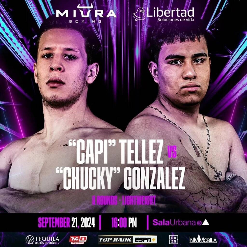 En el que será el turno semi estelar de la cartelera que ofrecerá Miura Boxing, empresa promotora que encabeza Manuel Garrido, que podrá ser vista a través de TVC Deportes en Mexico, ESPN+ para Estados Unidos y Canada y DAZN en el resto del mundo, Ricardo Téllez González se medirá al que es originario de Atizapán de Zaragoza, Diego “Chicky” González Ramos, en combate pactado a ocho episodios en la división de peso ligero.