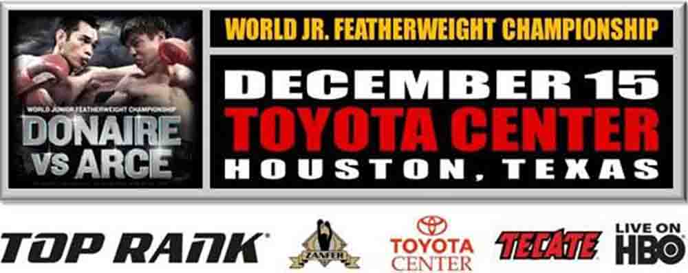 Remaining Tickets to the Donaire vs. Arce World Junior Featherweight Championship event doubleheader, priced at $200, $100, $60 and $30, plus additional fees, can be purchased at the Toyota Center box office (Monday through Friday, 9 a.m. to 6 p.m.), online at www.HoustonToyotaCenter.com, by phone at 866-4HOU-TIX (866-446-8849) and select Houston area Randalls stores. This prestigious event is promoted by Top Rank®, in association with Zanfer Promotions and Tecate.