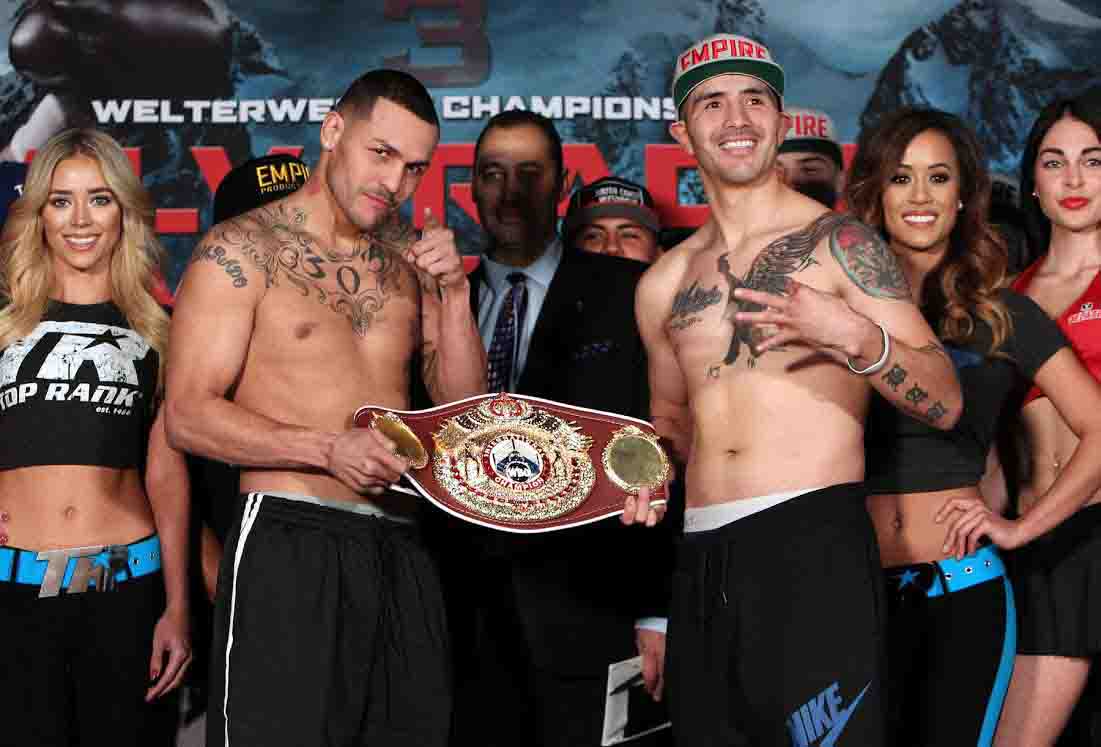 alvarado vs rios pesaje-chris farina-top rankEste combate será uno que defina la carrera de ambos pugilistas. Brandon “Bam Bam” Rios(32-2-1, 22 KO’s) de Oxnard California, viene de una victoria por descalificación frente al argentino Diego Chaves y el oriundo de Denver, Mike “Mile High” Alvarado (34-3, 23 KO’s) viene de una derrota frente el gran Juan Manuel Márquez.