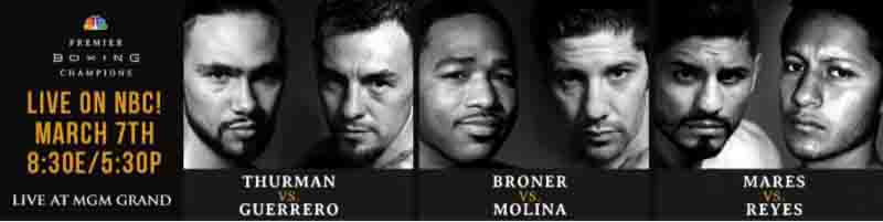 These fights are part of the blockbuster card featuring Keith Thurman vs. Robert Guerrero and Adrien Broner vs. John Molina, Jr. that will air live on NBC (8:30 p.m. ET/5:30 p.m. PT). The Abner Mares vs. Arturo Santos Reyes bout will be televised live on the NBC show (8:30-11 p.m. ET) or on the NBCSN telecast (11 p.m. ET).