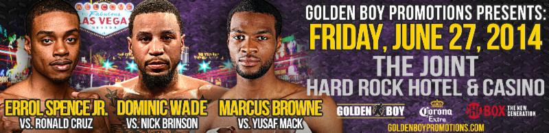 In the main event, Maryland’s Dominic Wade battles New York’s Nick Brinson in a clash of middleweights. Plus, two 2012 U.S. Olympians attempt to remain unbeaten as welterweight southpaw Errol Spence Jr. meets Pennsylvania’s Ronald Cruz and light heavyweight “Sir” Marcus Browne squares off with veteran Yusaf Mack. All three bouts are scheduled for 10 rounds.