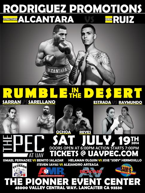 El sábado 19 de julio se estará presentando un cartel boxístico, desde las instalaciones del ‘Pionner Event Center’, donde en el evento principal se estarán enfrentado Eric Ruiz 12-1-0-6 de Oxnard, California ‘versus Jonathan Alcántara 6-10-2-1 de Novato, California, a 6 ‘rounds’ en peso gallo.