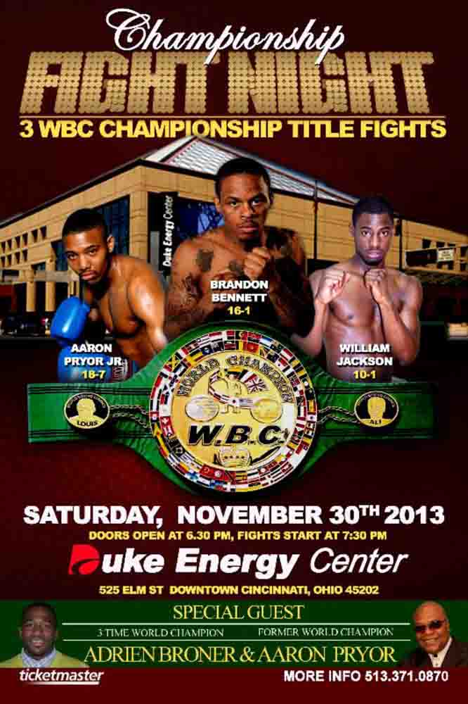 CINCINNATI — R&R Promotions is proud to present three WBC title fights featuring popular Cincinnati boxers Brandon “Untouchable” Bennett, Aaron Pryor Jr., and William Jackson Nov. 30 at the Duke Energy Center in Cincinnati. The “Championship Fight Night” event will be an exciting night of boxing with 12 bouts scheduled in total and is the first time in the USA three WBC titles will be up for grabs in one event.