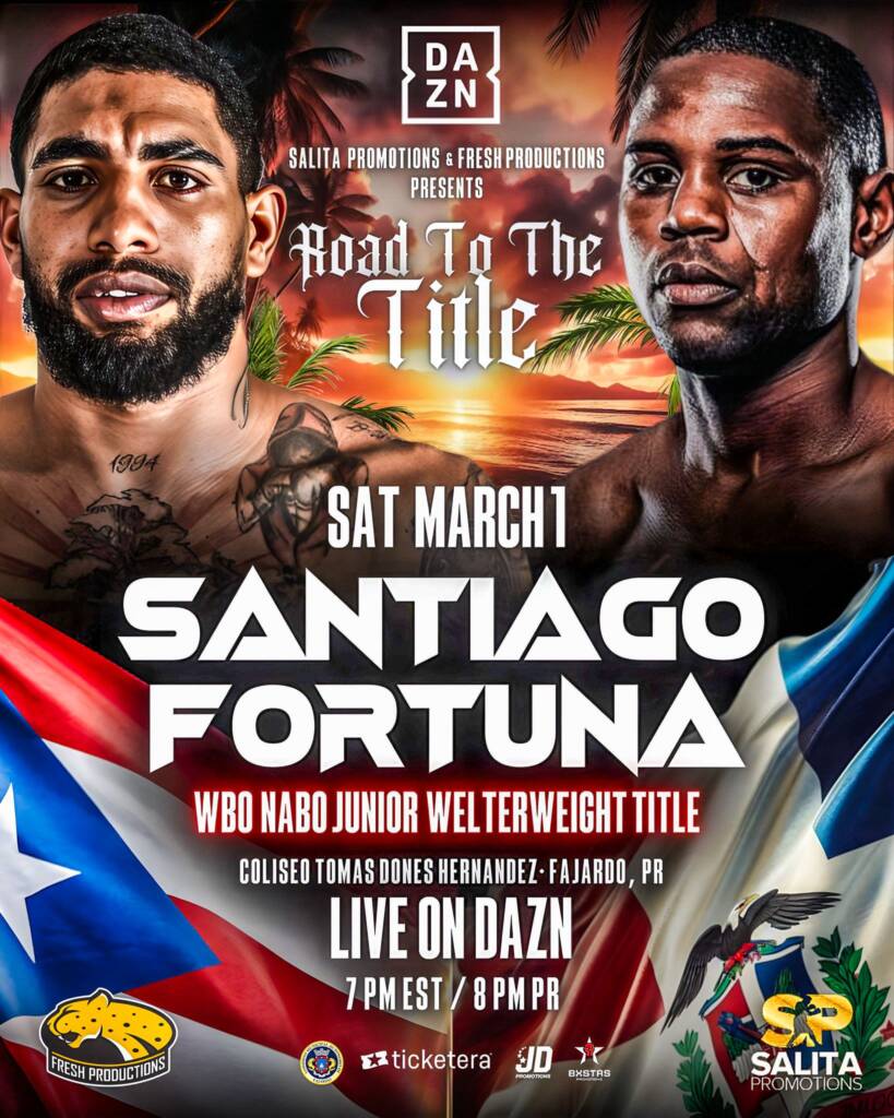 Santiago, de 30 años, llega tras un nocaut en el primer asalto ante Pedro Campa en noviembre de 2024. Por su parte, Fortuna, de 35 años, peleará en Puerto Rico por primera vez en su carrera y llega con una victoria por nocaut en diciembre de 2024 ante Jonatan Mariano.