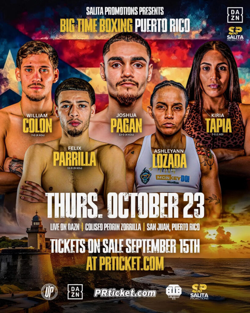 La cartelera también contará con tres de las estrellas emergentes del boxeo puertorriqueño: el invicto peso pluma Félix Parrilla (11-0, 9 KOs), considerado uno de los principales prospectos de la isla; el talentoso peso superpluma William “Yeyo” Colón (7-0, 4 KOs); y Kiria Tapia (7-0, 1 KO), otra figura destacada del boxeo femenino en Puerto Rico. Su participación reafirma el compromiso de Salita Promotions con impulsar el boxeo femenino y destacar a la nueva generación de talentos.