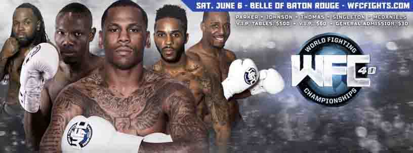 WFC_40BATON ROUGE, LOUISIANA – June 4, 2015This Saturday, Baton Rouge transforms into a fight town yet again, when World Fighting Championships presents WFC 40, showcasing the top professional boxing talent that The Capital City has to offer.  Justin Thomas (12-0, 6KO) headlines the event, facing Sacramento’s Mike Guy (7-1-1, 3KO).  A tough test for Thomas, Guy’s sole defeat came at the hands of Berlin, Germany’s Tyron Zeuge (17-0, 10KO) in Zeuge’s hometown.