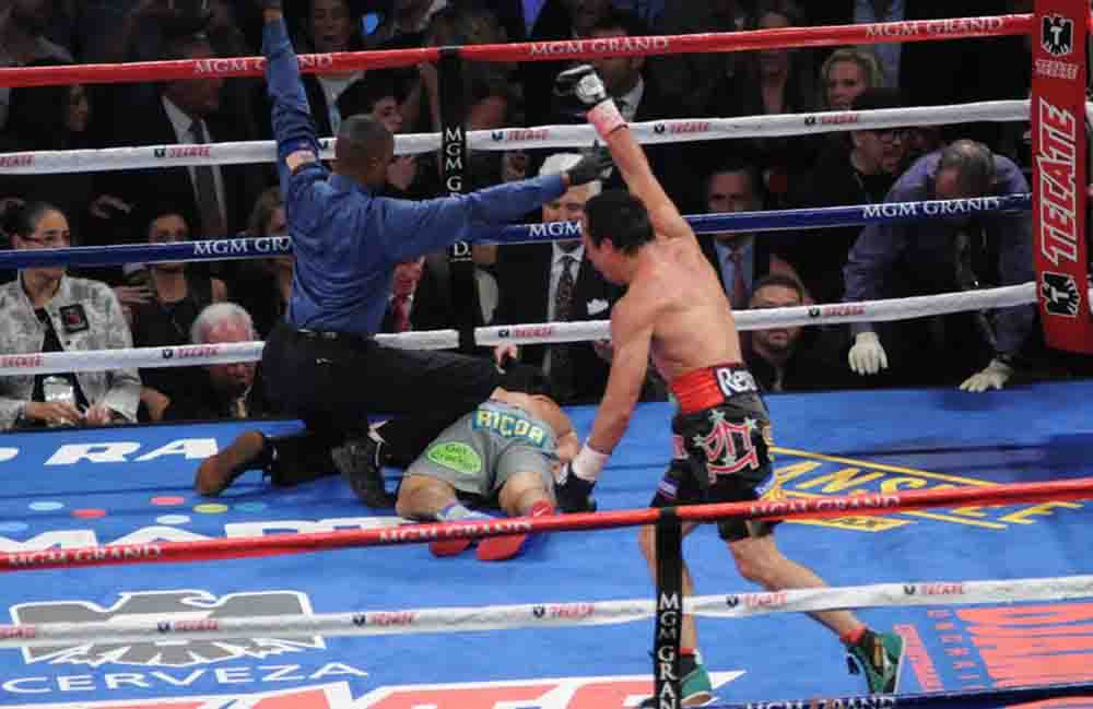 Pacquiao empezó el sexto asalto con frenesí, sin tomar prisioneros, pero como siempre Márquez le salió al ‘toro por los cuernos’ y anuncio:“ En ningún momento me sentí que estaba en serios problemas, al contrario mi lema es de menos a más y ya le tenía medido su método de atacar así que cuando me tiro el jab, me brinque su guardia y lo pude conectar sólido con una derecha en corto”.