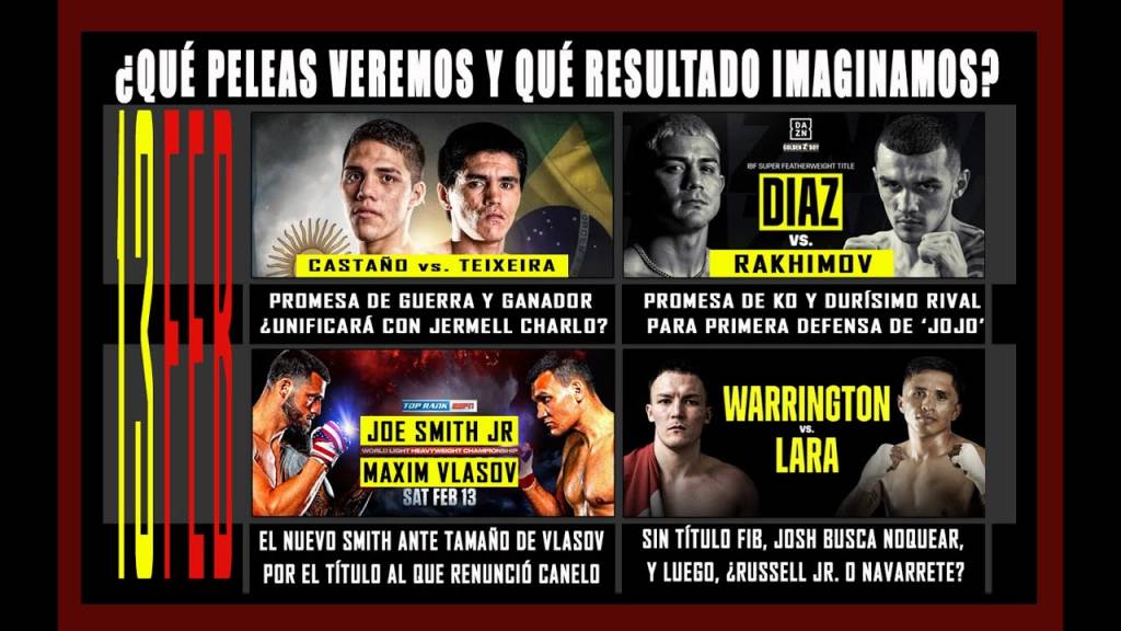 Esas dos peleas, necesariamente, son promesa de verdaderas guerras. La otra pelea que también despierta mucha expectativa y que promete ser muy animada, es la que definirá el nuevo campeón OMB de las 175 libras, el mismo cinturón al que renunció Saúl ‘Canelo’ Alvarez sin defenderlo luego de derrotar a Sergey Kovalev. En esa pelea el gran favorito Joe Smith Jr. deberá vencer al ruso Maxim Vlasov para coronarse.