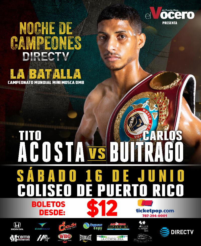 El “Campeón Del Pueblo”, Angel ‘Tito’ Acosta (17-1, 17KOs) defenderá por primera vez su campeonato mundial mini mosca de la Organización Mundial de Boxeo ante toda su gente en Noche de Campeones DIRECTV: “La Batalla” cuando enfrente al peligroso nicaraguense Carlos ‘Chocorroncito’ Buitrago (30-3-1, 17KOs) en un combate a 12 asaltos desde el majestuoso Coliseo De Puerto Rico. ‘Tito’ Acosta se convirtió en campeón mundial el pasado 2 de diciembre del 2017 cuando derrotó por nocaut en 10 asaltos al mexicano Juan Alejo en el Madison Square Garden de Nueva York. “La Batalla”: Tito Acosta vs. Carlos Buitrago desde el Coliseo de Puerto Rico será transmitido en vivo por DIRECTV a más de 60 países del mundo y es presentado por Miguel Cotto Promotions y H2 Entertainment.