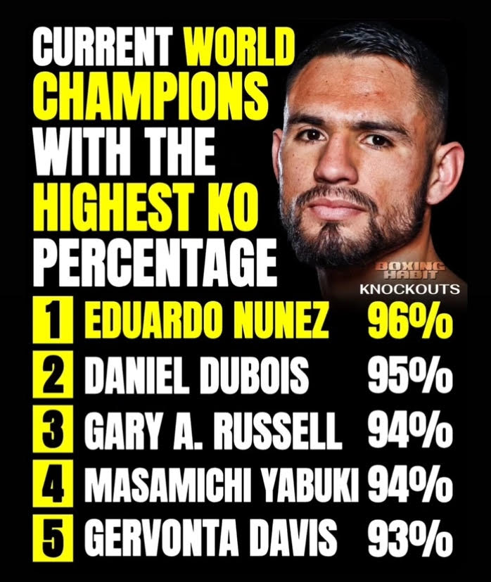 Con un 96% de efectividad, producto de 27 nocauts en 28 victorias, el mochitense Eduardo ‘Sugar’ Núñez es el monarca absoluto con mayor porcentaje de nocauts de la actualidad, un logro digno de admiración hacia el orgullo de Jahuara II que recién conquistó la corona superpluma IBF al vencer a domicilio a Masanori Rikiishi, única victoria por la vía de las tarjetas en la trayectoria del discípulo de Don Manuel ‘Cochul’ Montiel, y de sus hijos Manuel, Pedro y Eduardo.