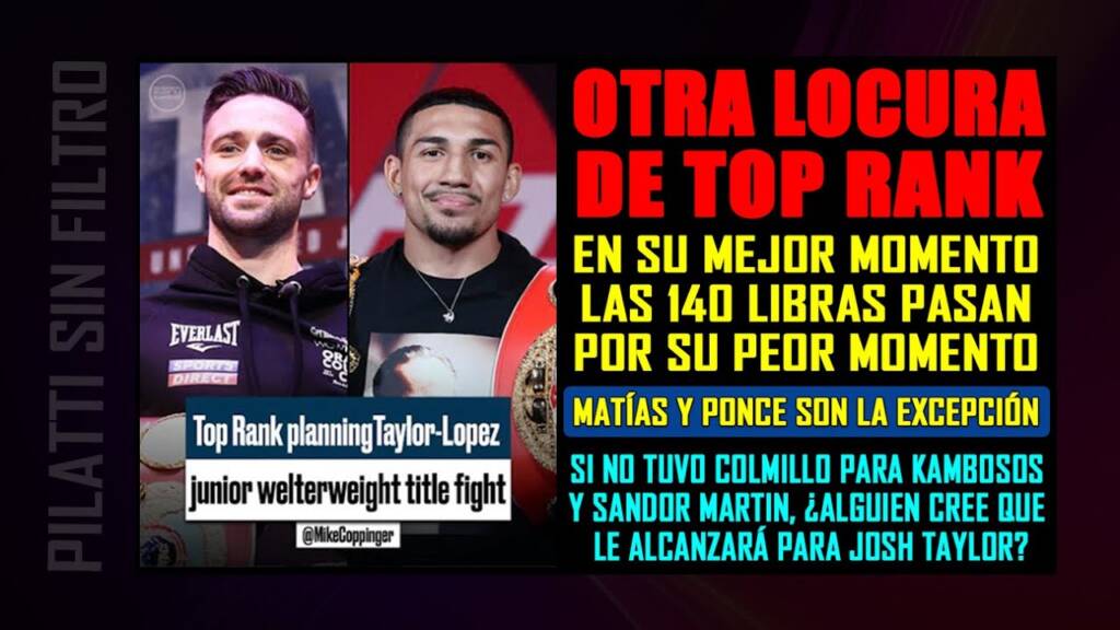 La desatinada pelea, puede ser la cereza en la torta de un pésimo incongruente momento de la división superligera, cuando le sobran figuras importantes para disputar atractivas peleas de título. Solo basta que los hagan pelear. En este video, analizamos la gestión encaminada para que Taylor regrese contra Teofimo y el resto de la división, donde solo parece salvarse la pelea del 25 de febrero entre Subriel Matias y Jeremias Ponce por el cetro FIB.