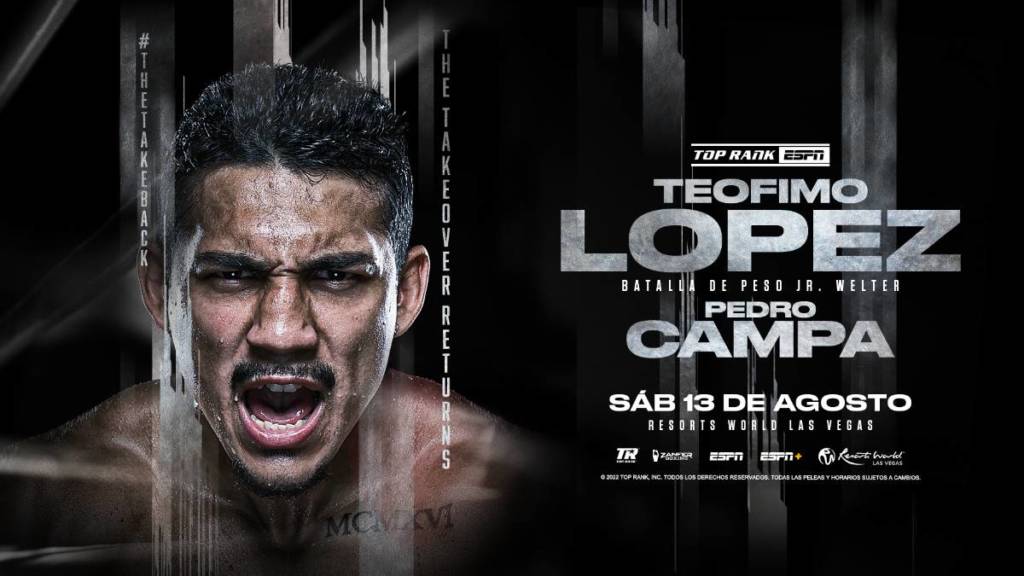 “Estoy emocionado y agradecido con Top Rank y Teofimo Lopez por esta oportunidad. Es un tremendo peleador”, dijo Campa. “Vengo a Resorts World Las Vegas listo para implementar todo lo que he aprendido con mi increíble entrenador, Manny Robles. Hemos estado en el Sur de California trabajando duro y preparándonos para la mejor versión de Teófimo López. Creo que puedo ser una fuerza en las 140 libras, y ahora solo depende de mí demostrarlo el 13 de agosto”.