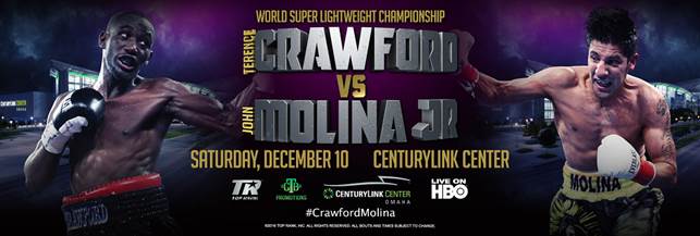 OMAHA, NEB. (December 8, 2016) — Undefeated World Junior Welterweight Champion and top-rated pound-for-pound fighter TERENCE “Bud” CRAWFORD (29-0, 20 KOs), of Omaha, Neb., will make his bid for 2016 Fighter of the Year honors (to go with his 2014 award) when he makes the first defense of his unified World Boxing Organization (WBO) / World Boxing Council (WBC) / Ring magazine 140-pound world titles. Crawford rumbles with one-time world title challenger and current No. 1 contender JOHN MOLINA JR. (29-6, 23 KOs), from Covina, Calif., on This Saturday! December 10, at CenturyLink Center Omaha (455 North 10th St., Omaha, Neb. 68102.)
