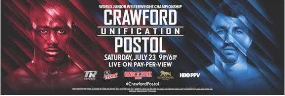 LAS VEGAS, NV. (May 10, 2016) — Undefeated junior welterweight champions TERENCE “Bud” CRAWFORD and “The Iceman” VIKTOR POSTOL will go mano a mano, in a 12-round world title unification fight, to determine the lineal king of the exciting 140-pound division. The Crawford vs. Postol world championship event will take place on Saturday, July 23, at the MGM Grand Garden Arena in Las Vegas, Nev. It will be produced and distributed live by HBO Pay-Per-View beginning at 9:00 p.m. ET / 6:00 p.m. PT.