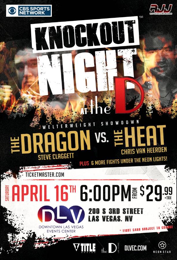 The Apr. 16th “Knockout Night at the D” event will air Saturday night, April 16 (8 p.m. PT / 11 p.m. ET), live on CBS Sports Network from under the neon lights at the DLVEC outdoor venue.