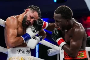 Baraou quickly took control as he came fortward firing jabs though Tellez’s guard and connecting with body punches. Southpaw Tellez had a better second as he jabbed strongly and found the target with uppercuts and did enough to win the round despite a late attack from Baraou. The third and fourth saw Baraou step up the pressure forging forward putting Tellez against the ropes and landing to head and body. Tellez went on the front foot in the fifth landing some sharp combinations. Pressure from Baraou was closing down Tellez’s attacks but he ended the round strongly and again had some success with uppercuts but just could not keep Baraou out. The sixth and seventh saw Baraou swarming all over Tellez taking him to the ropes landing hooks and uppercuts inside with very little coming back from Tellez. The fight was getting away from Tellez and Baraou just seemed to get stronger and stronger. Tellez landed some combinations at the start of the eighth but then Baraou took over again forcing Tellez to the ropes and he rocked Tellez with a left hook. Tellez stood and traded punches in the ninth and both landed well to the body. Tellez again stood and exchanged shots at the start of the tenth. Baraou seemed to have slowed and Tellez was scoring with hooks and uppercuts and putting together some impressive combinations but was running out of rounds. It had been a high-paced fight and both fighters looked to be tired in the eleventh but Tellez was fighting with desperation as he must have known he was behind and once again he was firing hooks and uppercuts landing heavily to the body and won the round. Any chance Telez had of winning  disappeared in the last few seconds of the fight.  Baraou’s pressure had him on the way to winning the round and just before the final bell he pinned Tellez against the ropes and connected with three left hooks that had Tellez staggering along the ropes and down. Tellez got up and the bell went just as the eight count was completed. Scores 117-110, 116-111 and 115-112 for Baraou. This was Baraou’s first fight for 14 months but he showed no rust. WBO champion Xander Zayas was in attendance and that would make a good title fight. Tellez had scored wins over Sergio Garcia, Johan Gonzalez and Julian Williams but will have to rebuild and await another title chance.