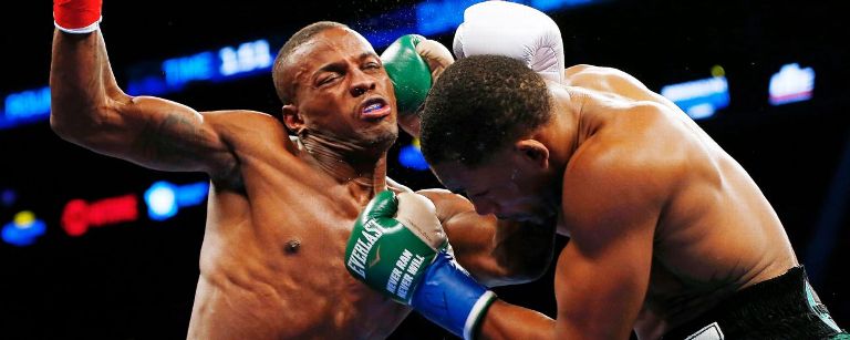 Jacobs defends his secondary WBA title with controversial early stoppage of Quillin. At the start both fighters prodded out jabs but were short. Both also tried rights but neither landed. Quillin was coming forward with Jacobs on the back foot looking for openings. Suddenly Jacobs came forward and threw a jab masking an overhand right that thudded into the head of Quillin who staggered back a couple of steps. Jacobs jumped on him immediately and took him to the ropes and threw a series of punches to head and body. Quillin managed to escape from the ropes only to be driven back and again be under attack from a storm of punches. Quillin pushed his way off the ropes but Jacobs was sensing blood with Quillin on shaky legs and he took Quillin to the ropes for the third time and landed a flurry of shots ending with two fierce punches to the head that sent Quillin sliding along the ropes. It looked as though Quillin was going to end up on the floor and anticipating that the referee went to restrain Jacobs. However Quillin managed to stay on his feet and when the surprised referee realised that he stepped over to Quillin, took a good look at him and decided he was unsteady on his legs and wrapped his arms around Quillin and stopped the fight. It was probably the right decision as Quillin’s legs were unsteady but as it was a title fight and as he had not actually been down you might expect he would have been given an eight count but there was no eight count in the rules. So “Miracle Man” Jacobs, 28, makes the third defence of his WBA title and gets win No 28 by KO/TKO. The “Miracle Man” tag is well deserved as he recovered from a rare bone cancer to continue his career. “Kid Chocolate” Quillin, 32, is a former WBO champion who made three defences before relinquishing the title in September last year. Despite being out of the ring for a year he challenged new champion Andy Lee for the WBO title in April but failed to make the weight and it went ahead as a non-title fight and ended as a draw.
