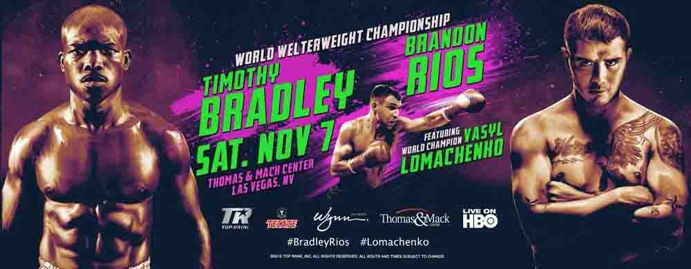 Bradley vs. Rios will take place This Saturday!  November 7, at the  Thomas & Mack Center, located on the campus of the University of Nevada, Las Vegas, and will be televised live on HBO World Championship Boxing®, beginning at 9:30 p.m. ET/PT.