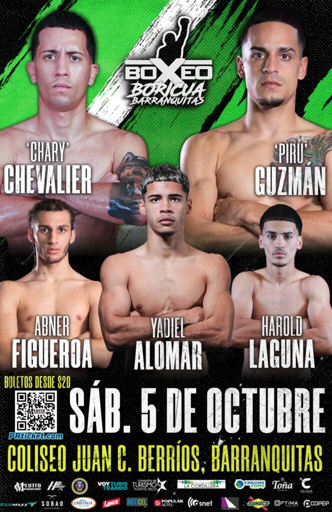 Otros grandes prospectos que estarán en acción en Boxeo Boricua en Barranquitas del sábado 5 de octubre lo será el prospectos en ascenso Yadiel Alomar (2-0, 1KO) en un combate a 4 asaltos en las 130 libras, de Naranjito el prospecto invicto en 5 combates Abner Figueroa y el gran debut profesional de uno de los grandes hijos de Barranquitas; José Díaz a 4 asaltos en las 130 libras. “este sábado debutaré ante mi gente, de veras bien contento y ansioso que ya sea el sábado y me vean que me apestan las manos”, dijo José Díaz.