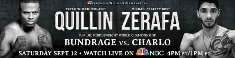 The September 12 Premier Boxing Champions on NBC card is headlined by undefeated middleweight star Peter “Kid Chocolate” Quillin (31-0-1, 22 KOs) taking on Michael “Pretty Boy” Zerafa (17-1, 9 KOs) in a 10-round middleweight bout with world title implications on the line for former world champion Quillin. Super welterweight world champion Cornelius “K-9” Bundrage (34-5, 19 KOs) will defend his title against undefeated rising star Jermall Charlo (21-0, 16 KOs) in the co-main event. Live coverage begins at 4 p.m. ET/1 p.m. PT on NBC.