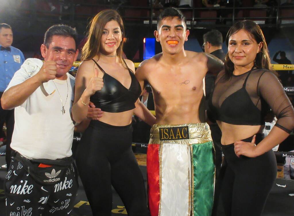 Isaac Sánchez demostró que no le asustan los retos y con su poder de puños noqueó en el primer round a Ricardo Alquicira, quien visitó la lona, por lo que el tercero sobre la superficie detuvo la riña al considerar que se encontraba en malas condiciones, la pelea fue en peso pluma.