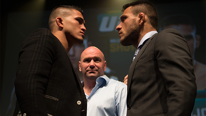 Rafael dos Anjos (23-7) viene con una trayectoria distinta. Con más de seis años y 17 peleas dentro del octágono desde que debutó en 2008, el brasileño ha lucido estable y sobretodo en constante mejoría a lo largo de los años. Principalmente reconocido como un peleador con enfoque de piso, siendo cinta negra de jiu-jitsu brasileño, dos Anjos se ha convertido en un verdadero peleador de artes marciales mixtas, y cada vez muestra unmuay thai más técnico y potente cada vez que sube a pelear. Ha ganado ocho de sus últimas nueve peleas, cayendo solamente ante el altamente considerado Khabib Nurmagomedov en abril de 2014 por decisión unánime. Rafael dos Anjos ha lucido fulminante, especialmente en sus últimas dos salidas, noqueando al ex campeón Benson Henderson en menos de tres minutos, y dominando por completo a Nate Diaz en el pasado mes de diciembre.