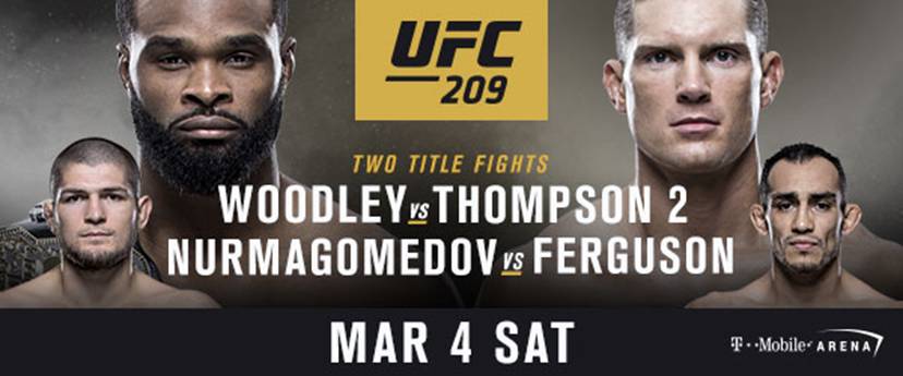 Las Vegas – UFC® kicks off their 2017 home schedule with two championship bouts and no shortage of bad blood on Saturday, March 4 at T-Mobile Arena with UFC® 209: WOODLEY vs. THOMPSON 2. Welterweight champion Tyron Woodley looks to prove once and for all that he is the best 170-pound fighter in the world when he meets Stephen “Wonderboy” Thompson for the second time and top-ranked Khabib Nurmagomedov clashes with No. 2 Tony Ferguson for the interim lightweight world title.
