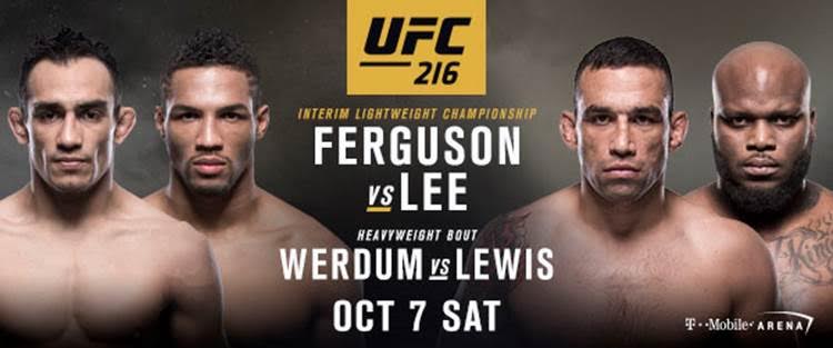 Las Vegas – The owner of the longest winning streak in the UFC® lightweight division finally gets his shot at gold when No. 2 Tony Ferguson collides with one of the sport’s most exciting young stars for the division’s interim title. No. 7 Kevin Lee has the same aspirations, while ultimately staring down the road at a potential unification bout against current champion Conor McGregor. In the co-main event, No. 2 heavyweight Fabricio Werdum looks to get back in the title hunt when he clashes with knockout artist No. 6 Derrick Lewis. UFC® 216: FERGUSON vs. LEE takes place on Saturday, Oct. 7 at T-Mobile Arena in Las Vegas. The event will air live on Pay-Per-View.