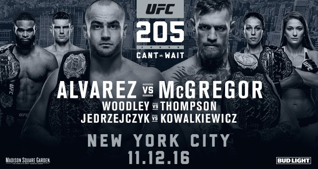 Las Vegas — For the first time in company history, the Octagon® lands in New York on Saturday, November 12. The historic Madison Square Garden will play host to the highly anticipated event and UFC® is bringing no shortage of star power to celebrate, as UFC® 205: ALVAREZ vs. McGREGOR plays host to three world titles bouts, featuring four current champions, including Eddie Alvarez, Conor McGregor, Tyron Woodley and Joanna Jedrzejczyk.