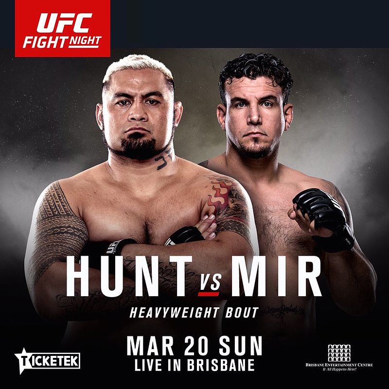 UFC Fight Night Brisbane, está estelarizado por los pesos completos Mark Hunt y Frank Mir y la co-estelar en peso welter entre el cubano Hector Lombard y Neil Magny. Este evento se transmite por UFC Network desde el Brisbane Entertainment Centre en Brisbane, Australia el sábado 19 de marzo a las 8pm MEX/11pm CHI la cartelera estelar. Las preliminares a las 6pm MEX/9pm CHI y las primeras preliminares por UFC Fight Pass y UFC Network a las 5pm MEX/8pm CHI.