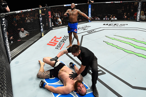 Después de algunos golpes sin respuesta, el referee detiene el combate y Derrick Lewis se queda con la victoria.