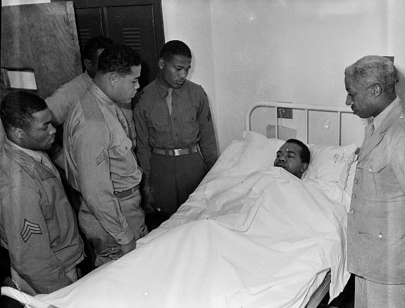 Robinson también respondió afirmativamente al llamado de su patria durante los años de la 2da Guerra Mundial. En la instantánea que encabeza esta cronica, el sgto Joe Louis y un muy joven cabo Robinson, visitan, en 1943, a un compañero herido de guerra en el hospital para veteranos Butler.