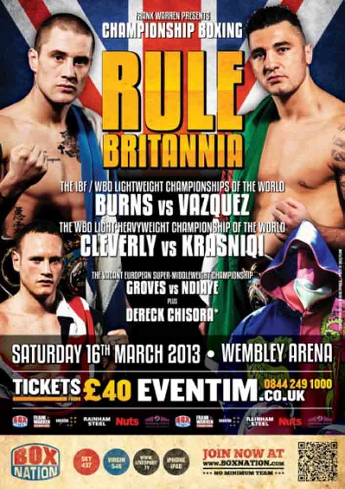Burns v Vázquez joint-headlines a blockbuster show with WBO World Light-Heavyweight Champion Nathan Cleverly’s title defence against Robin Krasniqi, plus George Groves challenging for the Vacant European Super-Middleweight title, heavyweight Dereck Chisora* and Commonwealth Super-Featherweight Champion Liam Walsh, live and exclusive on BoxNation (Sky Ch. 437/Virgin Ch. 546).