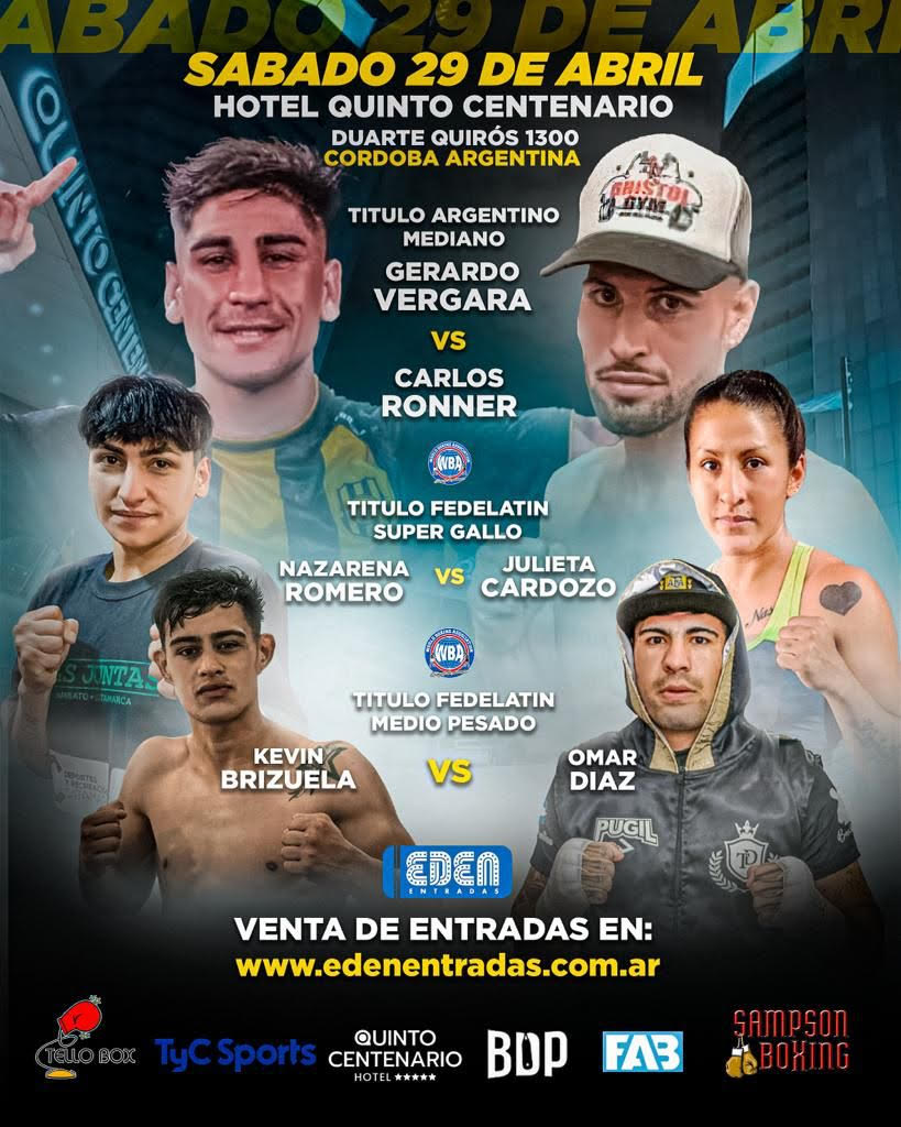 ARGENTINA – Un triple fondo con tres títulos en juego, acorde al majestuoso escenario en el que se desarrollará la velada, se llevará a cabo este sábado 29 de abril en el Hotel Quinto Centenario (ex Sheraton) de la ciudad de Córdoba, en otra realización de Sampson Boxing y Tello Box, con televisación de TyC Sports desde las 23:55.