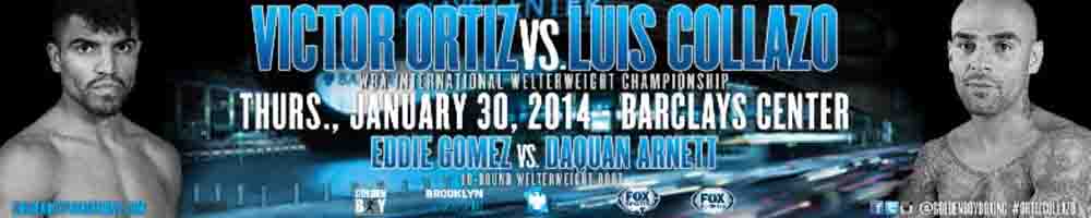 BROOKLYN, Nueva York 7 de diciembre de 2013. – Golden Boy Promotions junto con FOX Sports 1 y FOX Deportes retorna al Barclays Center en Brooklyn, Nueva York el jueves 30 de enero de 2014, con uno de los mejores duelos que la cadena ha proyectado hasta ahora, cuando se enfrenten los ex campeones mundiales Víctor “Vicious” Ortiz y LuisCollazo, orgullo del Brooklyn, en una batalla decisiva por el cetro Internacional welter versión AMB. Además, Eddie “E-Boy” Gómez, el fenómeno de Nueva York, se medirá a Daquan“King” Arnett, destacado prospecto de la Florida, en duelo de invictos y co estelar a 10 giros en peso superwelter.
