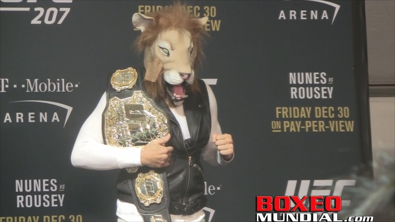Amanda ‘La Leona’ Nunes explaining the origins of her nickname and the lion mask at the UFC 207 post fight press conference. Earlier in the night Nunes defended her UFC bantamweight title with a one round TKO over Ronda Rousey.
