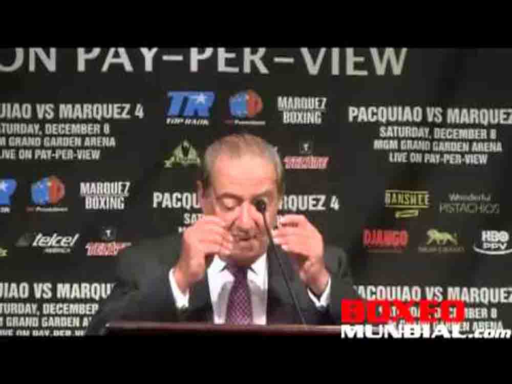 Bob Arum, trainer to Manny Pacquiao, speaks to the press at the Marquez-Pacquiao 4 post fight presser. Juan Manuel Marquez knocks out Manny Pacquiao in the 6th round Saturday at the MGM Grand in Las Vegas.