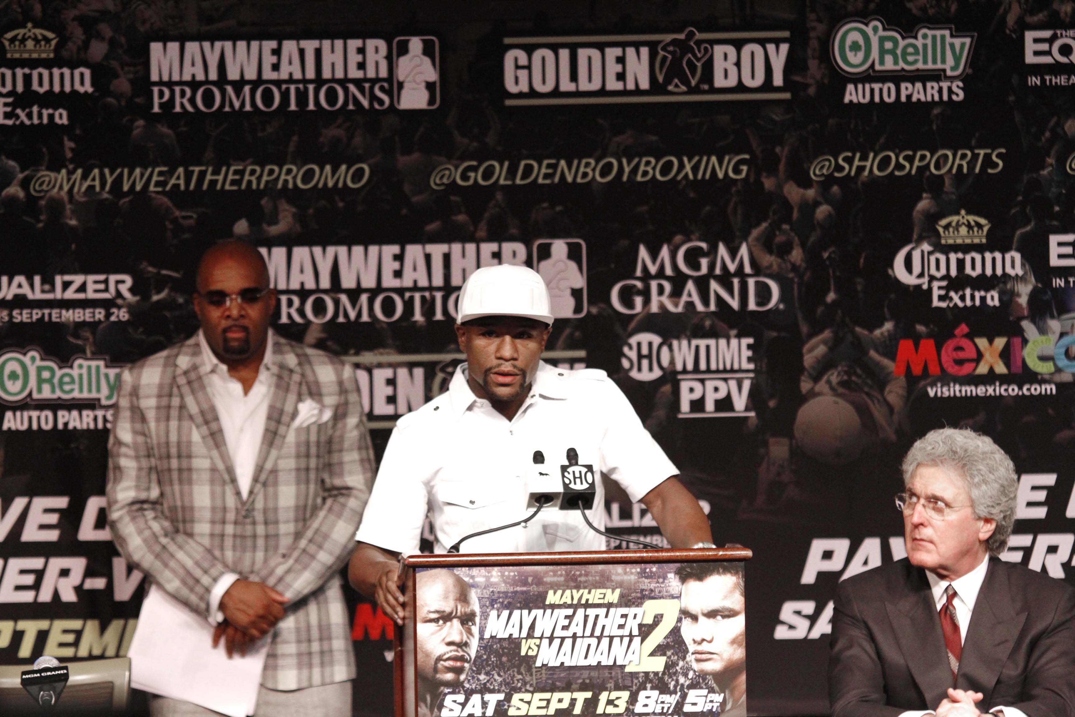 “MAYHEM: Mayweather vs. Maidana 2,” a 12-round world championship bout for Mayweather’s WBA Welterweight Belt and WBC Welterweight and Super Welterweight World Titles takes place Saturday, Sept. 13 at MGM Grand in Las Vegas and is promoted by Mayweather Promotions, Golden Boy Promotions and sponsored by Corona Extra, O’Reilly Auto Parts and “The Equalizer” in theaters Sept. 26 and Mexico – Live it to Believe It!. The event will be produced and distributed live by SHOWTIME PPV® (8 p.m. ET/5 p.m. PT) and is the fourth fight of a six-fight deal between Mayweather and Showtime Networks Inc. In the co-main event, Leo Santa Cruz defends his WBC Super Bantamweight Title against Manuel Roman in a 12-round bout and Miguel Vazquez faces Mickey Bey in a 12-round bout for the IBF Lightweight World Championship. In the pay-per-view opener, Alfredo Angulo squares against James De La Rosa in a 10-round middleweight bout (162 lbs.). The event will be also available in Spanish via secondary audio programming (SAP).