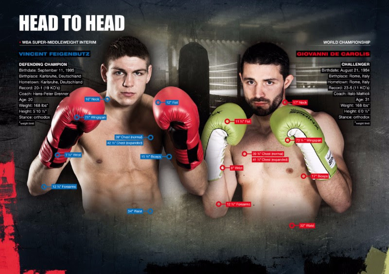 On Saturday night, Vincent Feigenbutz (20-1, 19 KOs) defends his interim WBA World Super Middleweight title against Giovanni De Carolis (23-5, 11 KOs) at the dm-Arena in Karlshrue, Germany. Ahead of their hotly anticipated championship contest we take a look at how the two fighters measure up.